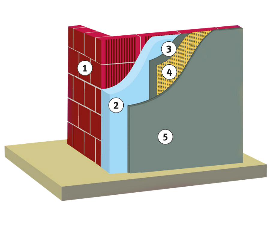 - Υφιστάμενες κατασκευές: Εφαρμόζεται στη θερμομόνωση υφιστάμενων κατασκευών και εξωτερικών ανακαινίσεων του κτιρίου. Προϊόν: ΚΕΒΕ GF Γκοφρέ